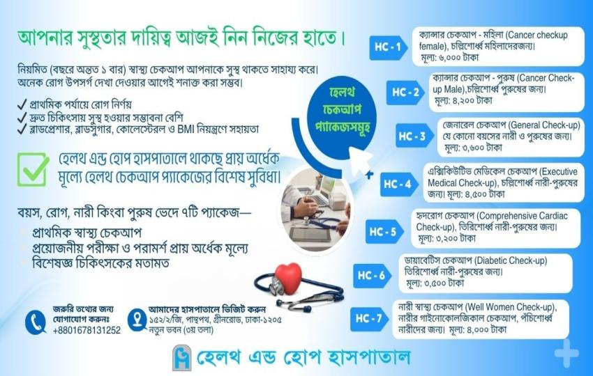 হেলথ এন্ড হোপ হাসপাতালে থাকছে প্রায় অর্ধেক মূল্যে হেলথ চেকআপ প্যাকেজের বিশেষ সুবিধা।